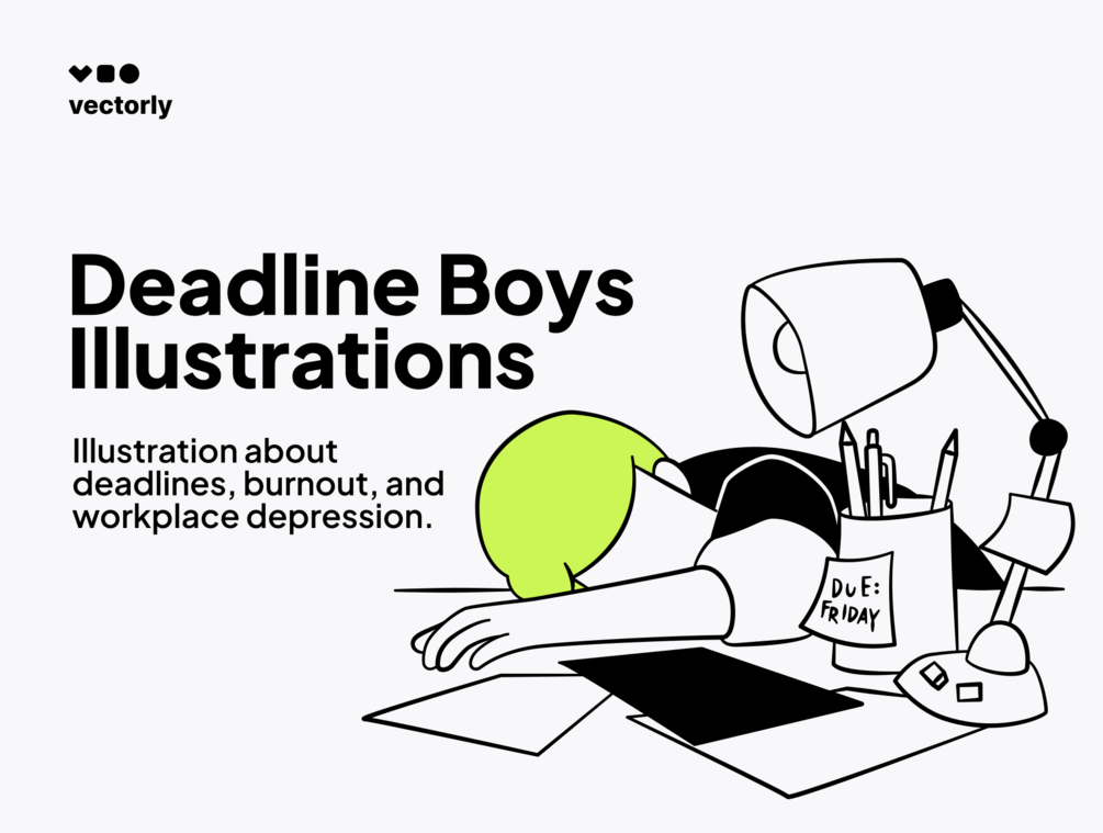 Illustration about deadlines, burnout, depression and workplace mental health.